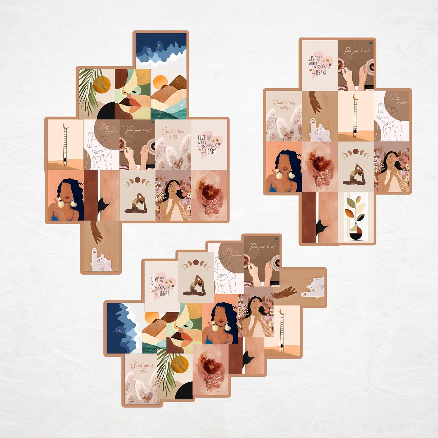 - Textured and Abstract Art: Includes a mix of abstract shapes, line art, sun motifs, botanical sketches, and desert landscapes for an authentic boho aesthetic.